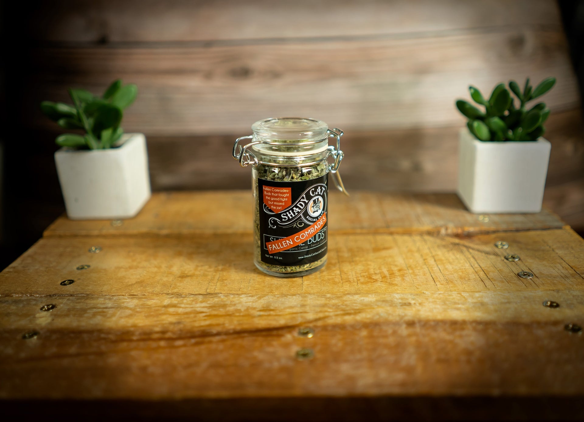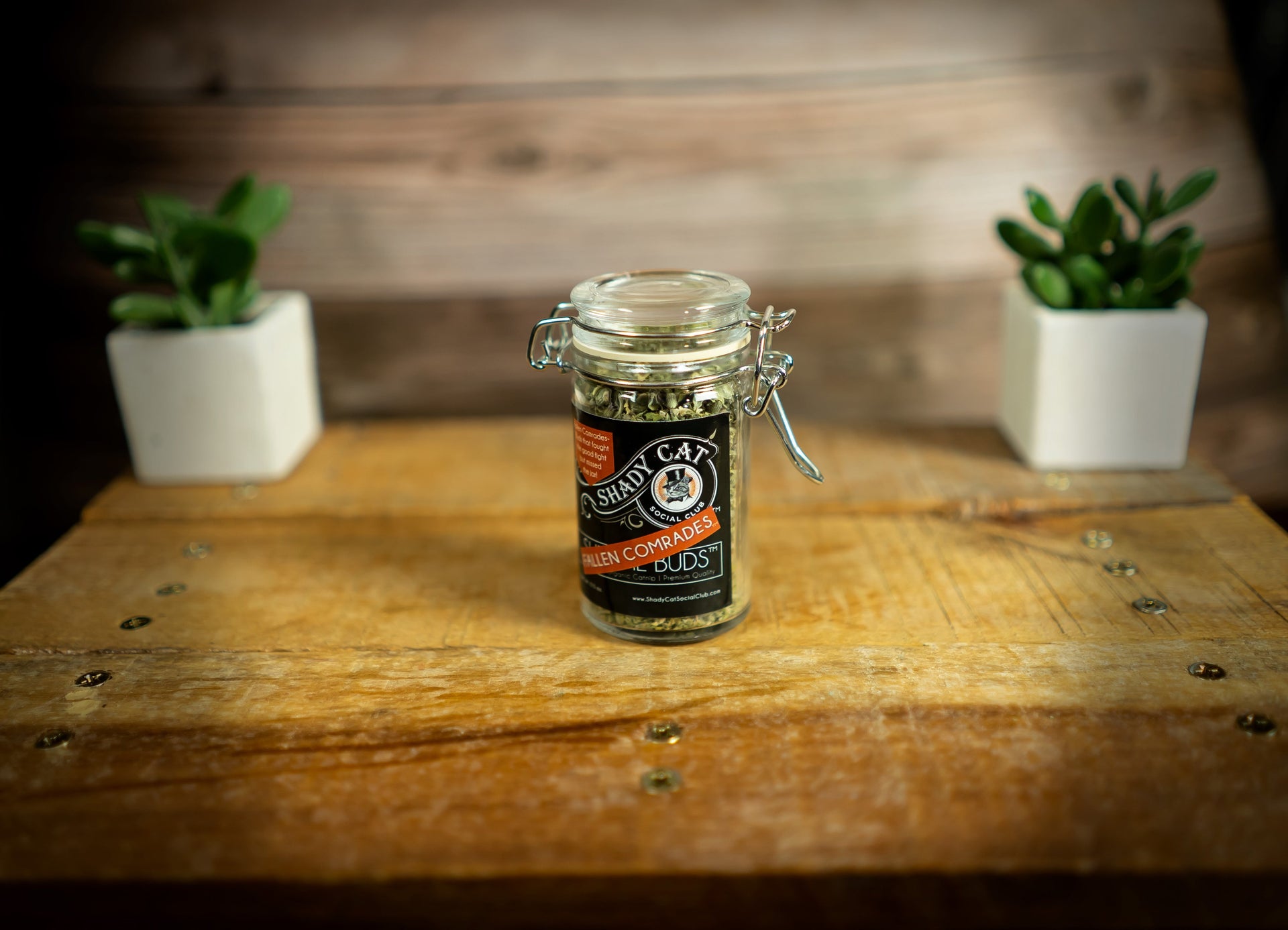 Oh, our **Fallen Comrades- possibly our most beloved product. These are the buds that shook loose or fell off of the stem when trimming and packing the Sublime Buds. They might not have completed their mission but know that they are just as potent and "honorable" as the other buds that made it to the jar in tact!